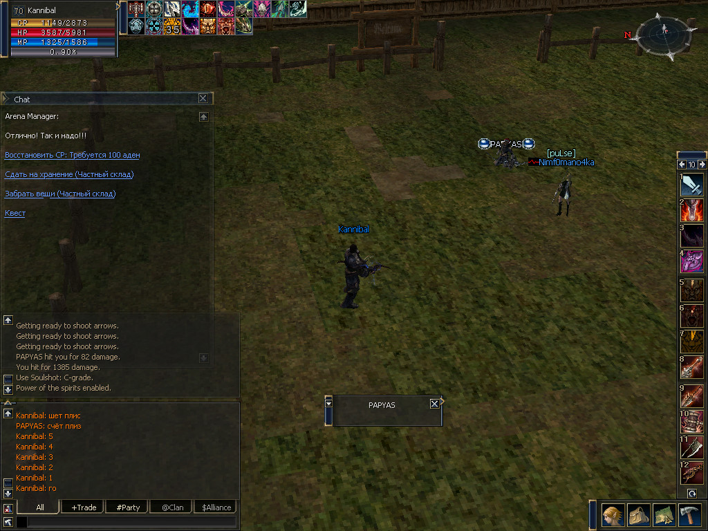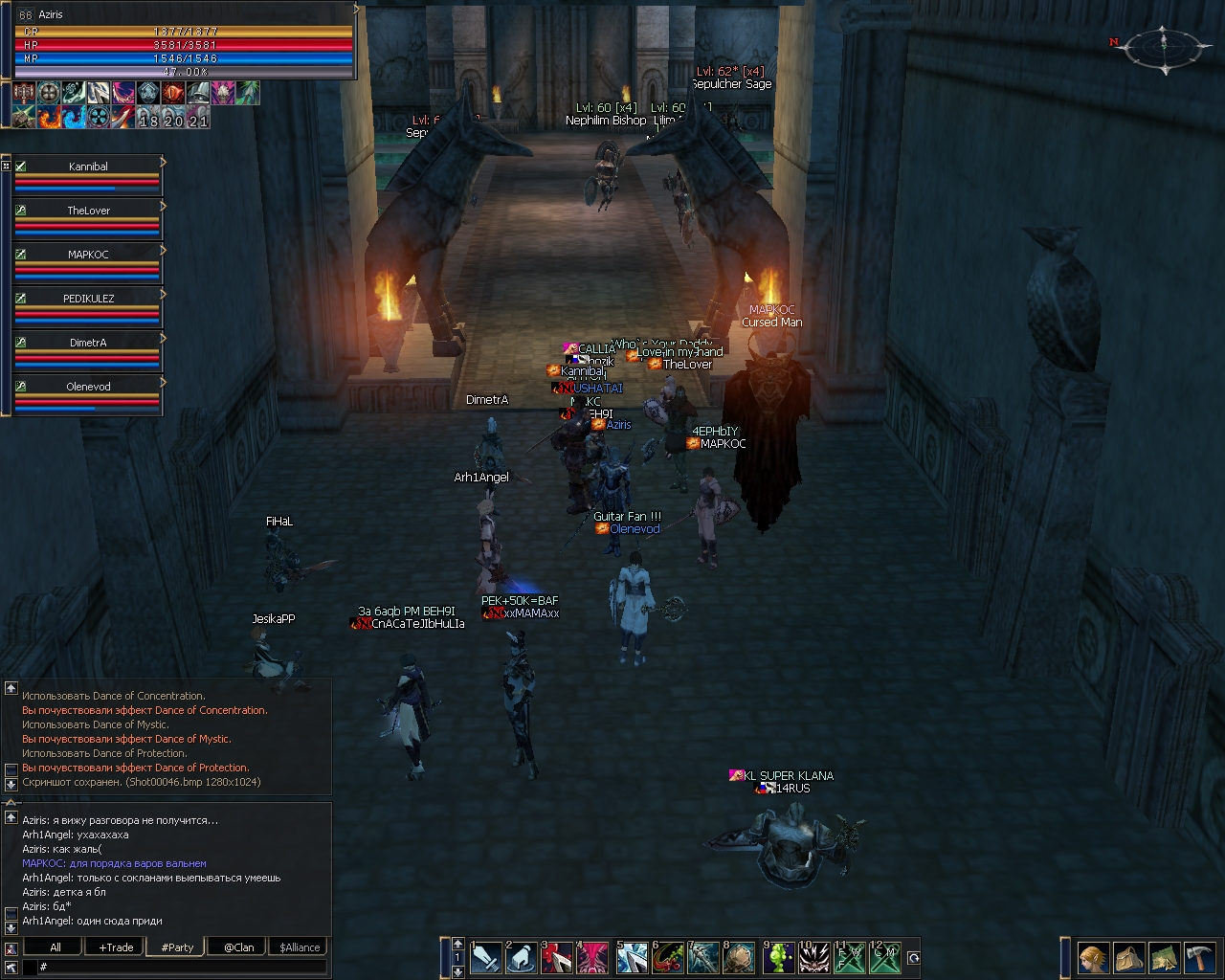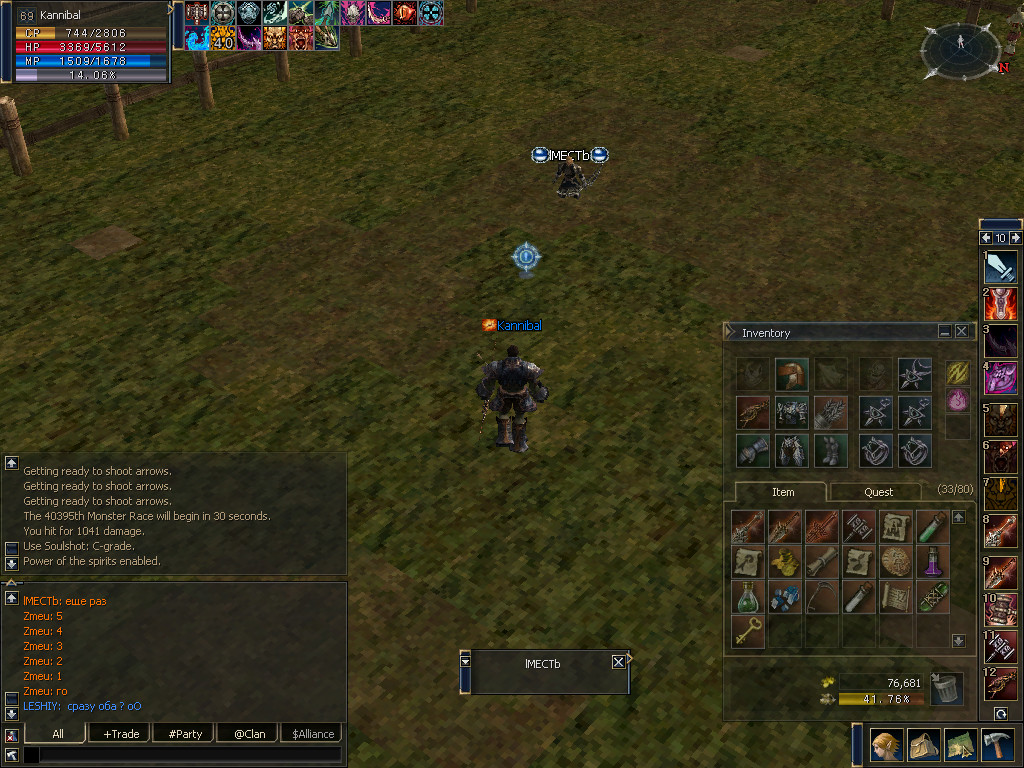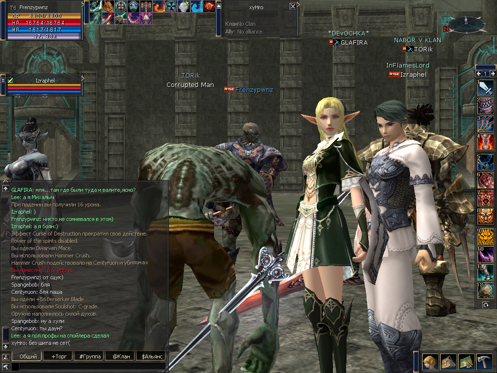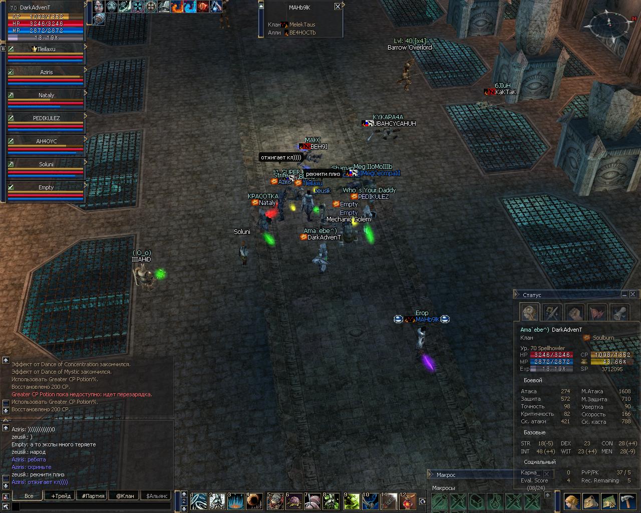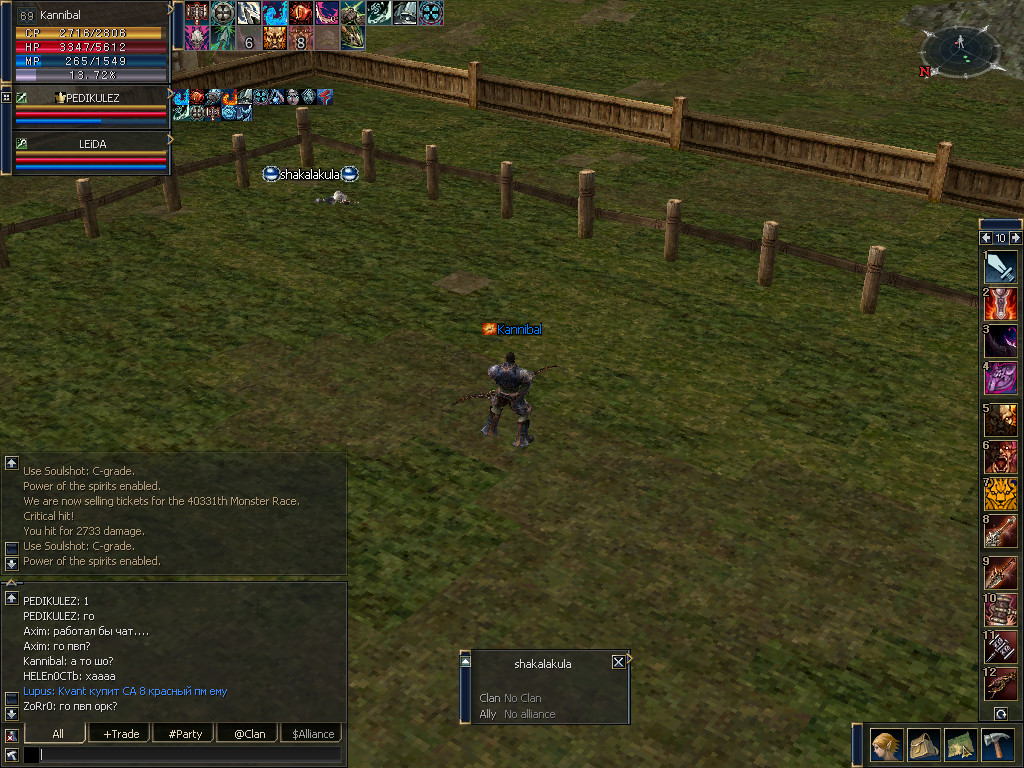 | Скрин вовсе не с этого сервера и вообще никакого отношения к нашему клану не имеет, если не считать того, что на нем Юра засветился... Но все равно скрин Зчотный ))) (сделал когда-то его Койот, кто его знает) Обратите внимание на панельку скиллов и системные сообщения в чате) Смысл в том, что это был первый СоМ на сервере. Дело было настолько неслыханное, что на Галю (Глафиру) сразу навалились с обвинениями, что его ей нарисовали. Скрин назывался "Чито-сомик" )) Койот добавил атмосферу чытерства. Я тогда этой веселухи не застал, к сожалению, вышел буквально за несколько минут до прихода Гали.